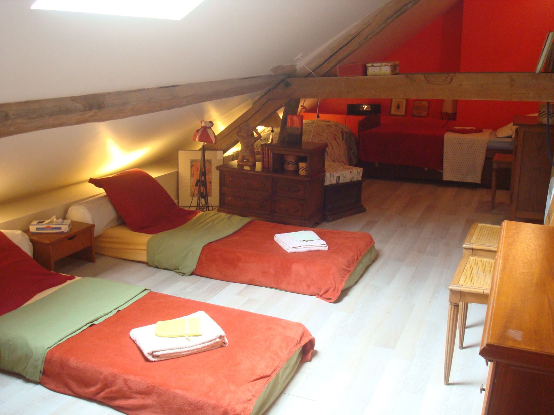 Dortoir avec 4 lits simples de 80 (dont 3 matelas sur le sol) dans espace mansardé; petits rangements.